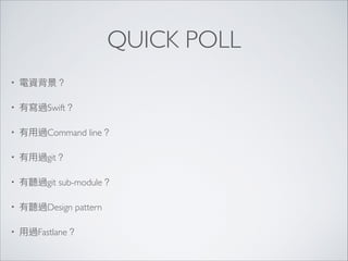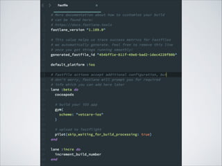This document summarizes a presentation on writing clean and effective iOS code. It discusses object-oriented programming principles like abstraction, encapsulation, inheritance and polymorphism. It also covers using snippets to avoid duplicate code, maintaining a clean project structure divided into modules, and applying design patterns. Automating tasks with Fastlane is also presented as a way to write less code through continuous integration.