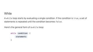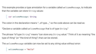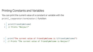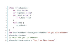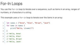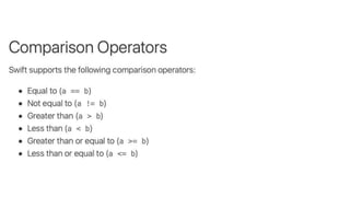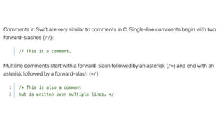 This document provides an overview of iOS development using Swift and Xcode. It discusses the core components of Swift like variables, functions, classes, and error handling. It also covers the main iOS frameworks like UIKit for building user interfaces with elements like view controllers, table views, and image views. Design patterns like MVC and Observer are explained as general solutions to common software problems. The document recommends using Xcode, Apple's integrated development environment, for iOS development as it is only available on Mac systems.