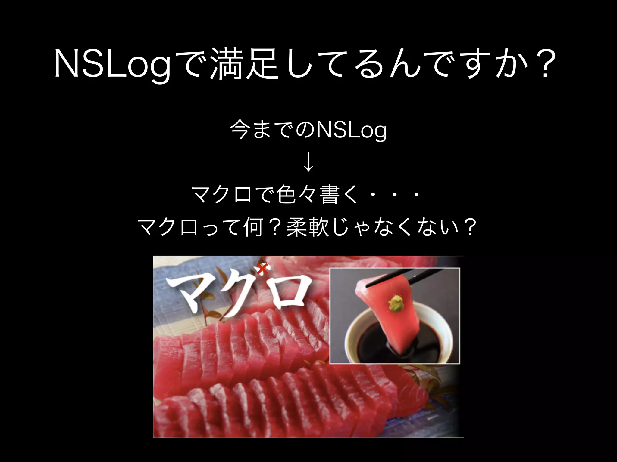 NSLogで満足してるんですか? 今までのNSLog ↓ マクロで色々書く・・・ マクロって何?柔軟じゃなくない?