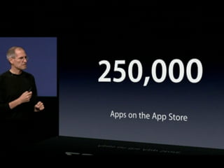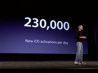 The document discusses the history and evolution of Apple's iOS mobile operating system and related products. It describes the launch of the iPod in 2001 and iTunes in 2001 which helped drive adoption of iOS. It then outlines the introduction of the iPhone in 2007, App Store in 2008, and iPad in 2010 which expanded iOS into new form factors and ecosystems. It also briefly touches on the success of iOS apps and games.