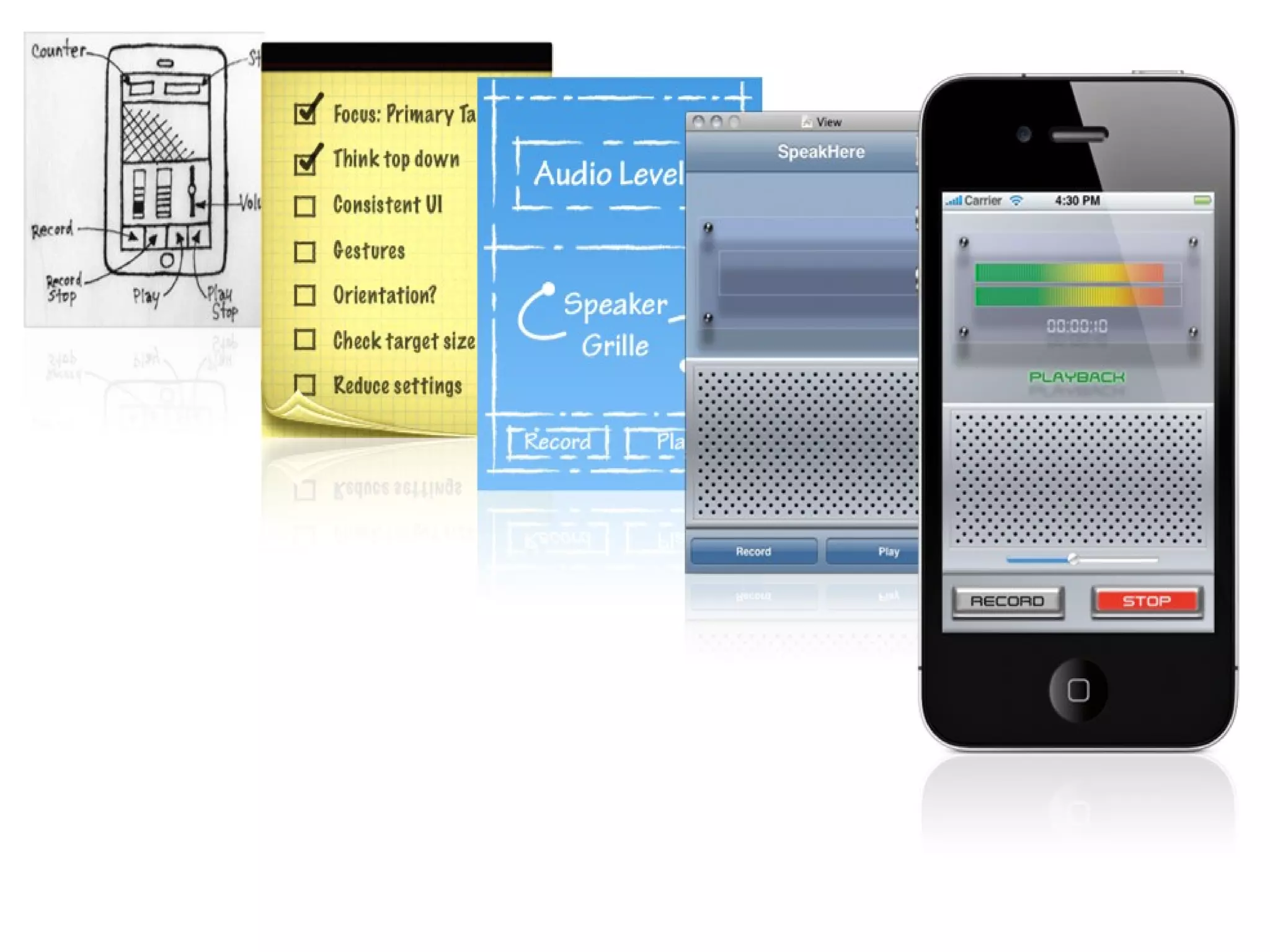 The document outlines key concepts in iOS application development, including the use of segues in storyboarding, dynamic UI design through coding, core animations, and implementing picture and sound managers. It details the lifecycle of segues, programming methods, and how to effectively manage images and sounds within an app. The document also provides code examples for initializing UI components, handling user input, and using system sounds.