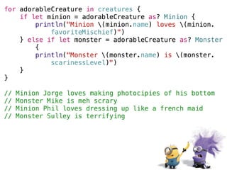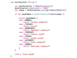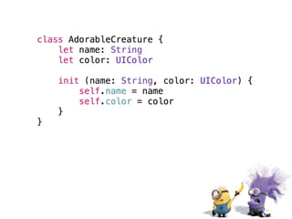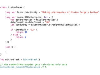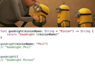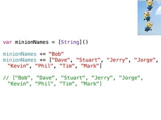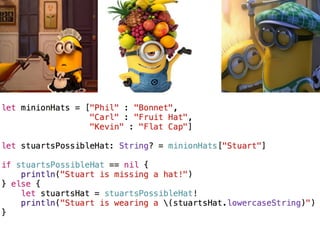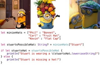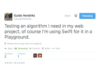 The document provides an overview of Swift basics including type inference, optionals, downcasting, functions, computed properties, and lazy properties. It then discusses using playgrounds to experiment and learn Swift. It highlights that everyone is a beginner and lists additional Apple and third party resources for learning Swift such as WWDC videos, Xcode, blogs, websites, and accounts to follow on Twitter.