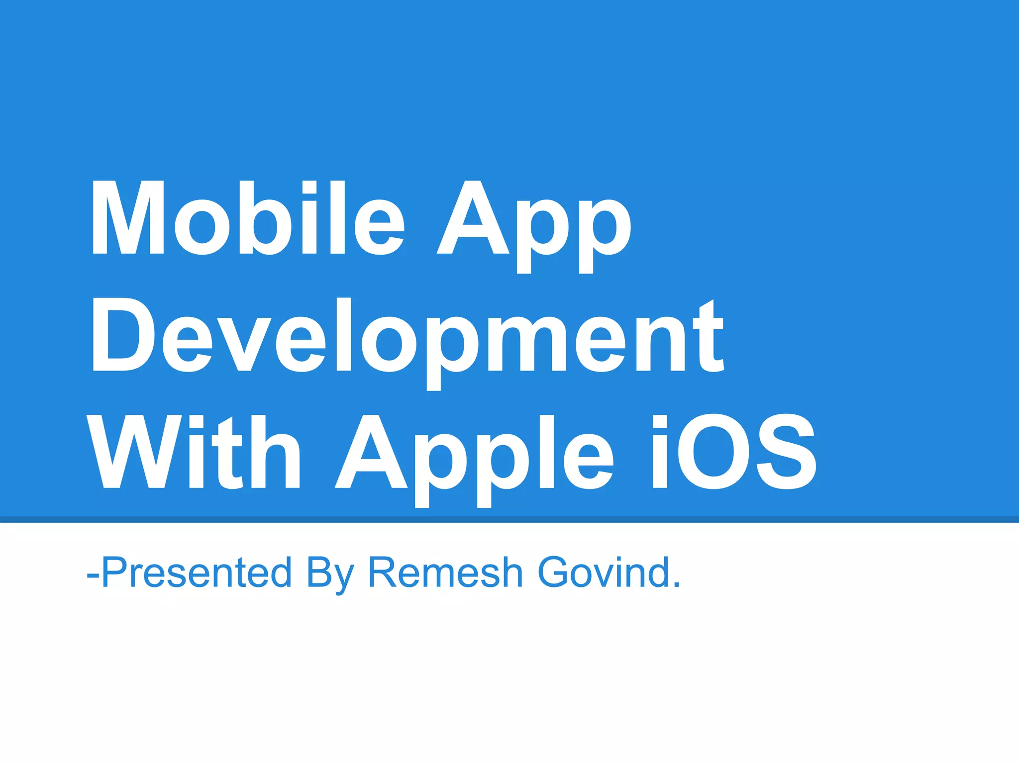 The document discusses mobile app development specifically for Apple's iOS, covering the evolution of mobile capabilities and various operating systems. It highlights the requirements for iOS development, such as Apple's Xcode tools and Objective-C programming language, as well as best practices for app lifecycle management and user interface design. The document also includes details on creating a simple app and considerations for device orientation and crash management.