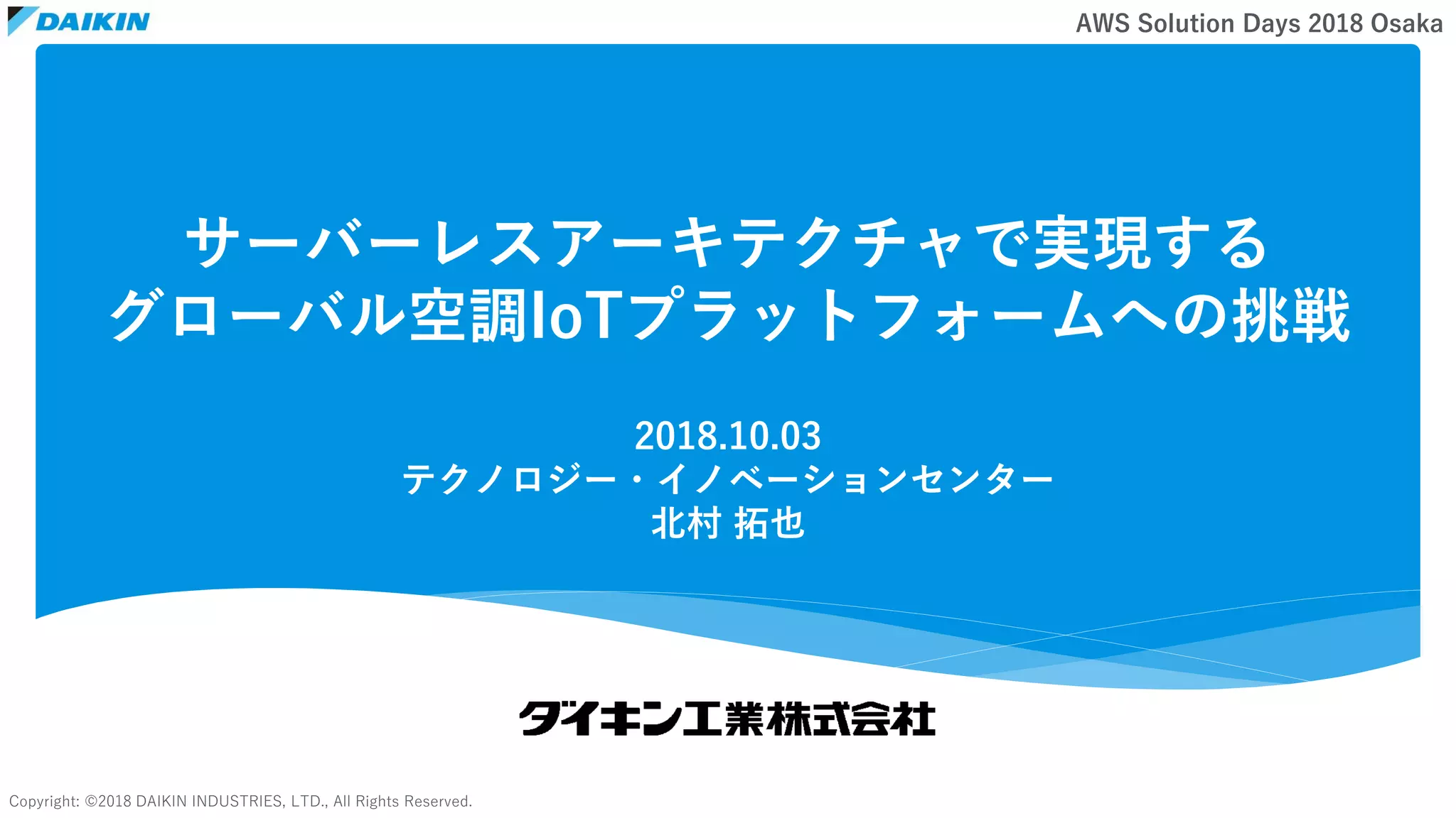 INDUSTRIES, LTD., All Rights Reserved. サーバーレスアーキテクチャで実現する グローバル空調IoTプラットフォームへの挑戦 2018.10.03 テクノロジー・イノベーションセンター 北村 拓也 AWS Solution Days 2018 Osaka