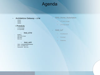The document outlines the basic RAS concept and architecture including RAS_GTW which is the basic gateway concept. It discusses Hardware Closed Software Closed Architecture (HCSCA), Hardware Closed Software Open Architecture (HCSOA), Hardware Open Software Open Architecture (HOSOA), and various RAS components like the gateway, RasBerry, cloud server, and applications for clients like mobile devices. Protocols and both short and long range low power networks are also mentioned for connecting devices in home automation and IoT scenarios.