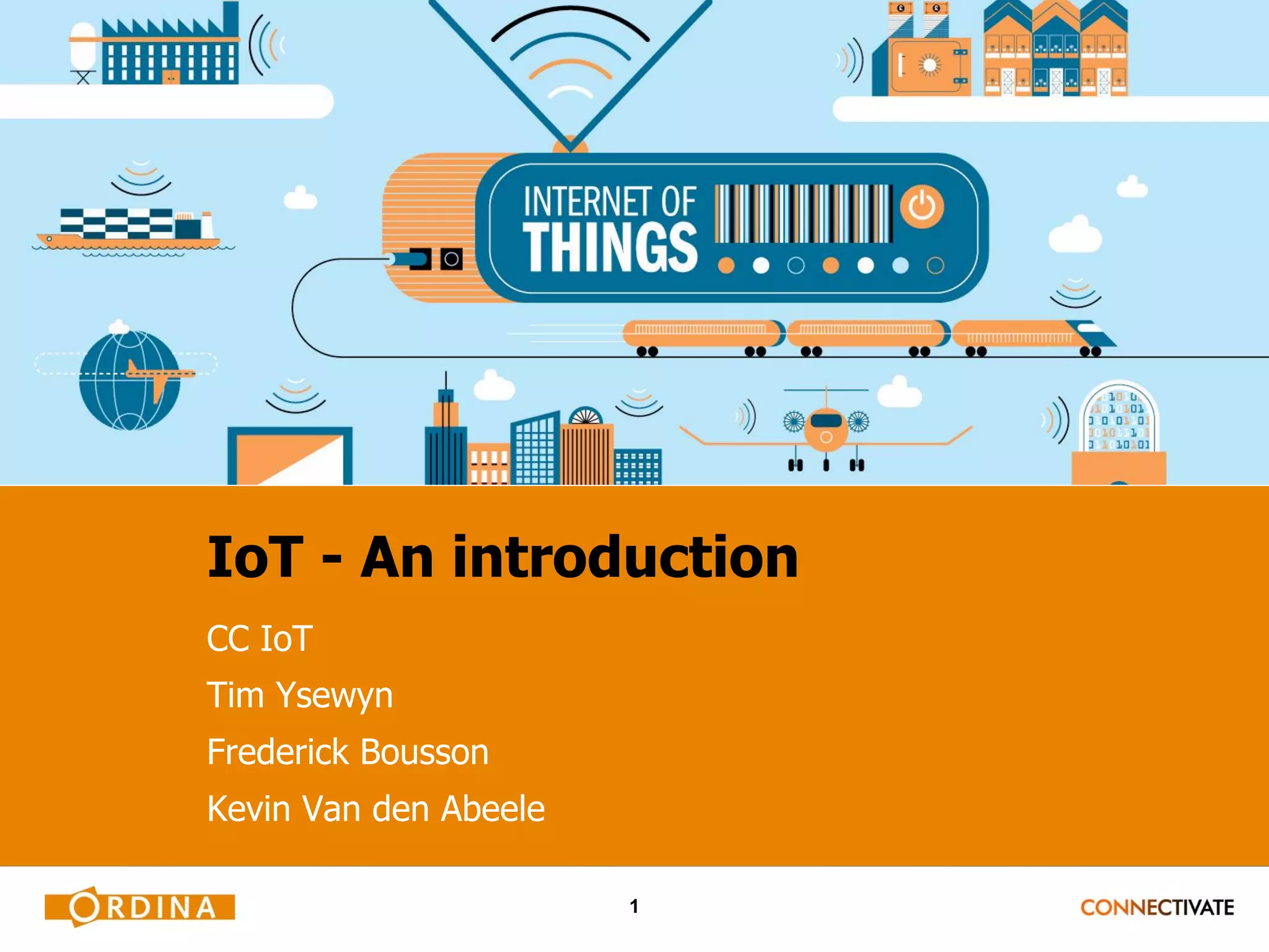 This document provides an introduction to IoT including: defining IoT as connecting physical items to the internet via sensors to collect and communicate data; discussing how IoT can benefit businesses through optimizing workflows and lowering costs; and describing common IoT devices and technologies like Arduino, Raspberry Pi, Intel Edison, Bluetooth LE, WiFi and distributed computing networks. The next session will focus on setting up the Raspberry Pi with an OS, using it for development, running Java programs, and controlling GPIO pins.