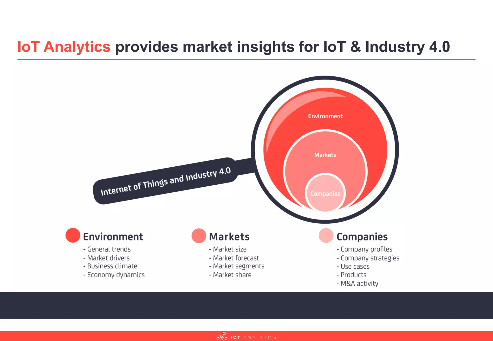 The document presents IoT Analytics, a leading market insights firm focused on IoT and Industry 4.0, detailing its services including market reports, insights, newsletters, and go-to-market strategies. It highlights a range of offerings such as targeted industry reports, databases, and custom research, while also showcasing engagement metrics like newsletter reach and report downloads. Additionally, it emphasizes the firm's data-driven approach and extensive expertise in the IoT space, backed by testimonials from industry partners.