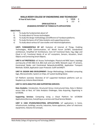 This document provides an overview of the Internet of Things (IoT) and its applications as lecture notes for a B.Tech course. It covers the fundamentals of IoT including enabling technologies, architecture, and functional components. It also discusses IoT access technologies, protocols, design methodology, hardware platforms, data analytics, supporting services, and various industrial and real-world case studies of IoT applications. The objectives of the course are to study the basics of IoT, its architecture, design principles, hardware platforms, data analytics, and industrial applications.