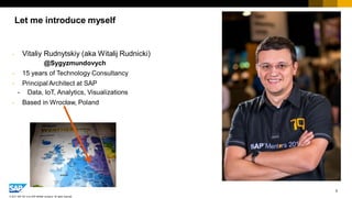 This document provides a summary of a presentation about IoT at scale. It introduces the presenter and their background working with data, IoT, analytics and visualizations. The presentation then outlines topics including how the internet is connecting people, content and things; deconstructing IoT into sensors, actuators, connectors and transport layers; communication protocols; hardware prototyping boards; affordable sensors; networks for IoT; and examples of using sensor data from a phone with SAP HANA, Lumira and virtual reality visualizations. It also discusses IoT and Industry 4.0, popular IIoT use cases, and business examples involving predictive maintenance and connecting vehicles.