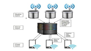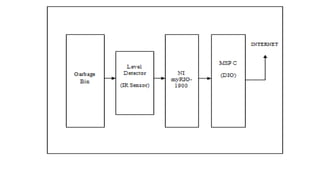 The document outlines an IoT-based intelligent bin system aimed at improving garbage management in smart cities, addressing issues caused by high population density. It describes the system's architecture, which includes smart bins equipped with sensors that monitor fill levels and communicate data to a server for optimizing garbage collection. The proposed solution promises advantages like efficient waste collection, reduced pollution, and support for public health, with future developments suggested for enhancing functionality.