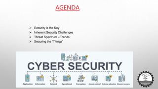 The document discusses cybersecurity challenges related to IoT. It outlines several security incidents involving IoT devices over time. It then discusses inherent security challenges for IoT, including threats from advanced persistent threats, cyber terrorism, and compromised supply chains. The document also summarizes statistics on IoT security concerns and vulnerabilities. It identifies top vulnerabilities according to OWASP and discusses how to secure IoT in different domains like smart cities and homes.