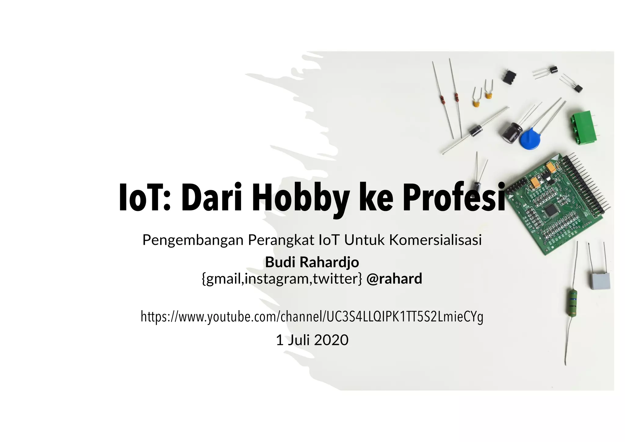 Dokumen ini membahas perkembangan Internet of Things (IoT) dari hobi menjadi profesi, menekankan pentingnya pengembangan sumber daya manusia (SDM) di bidang ini untuk menghadapi tantangan industri 4.0. Dengan meningkatnya permintaan dan kemajuan teknologi, IoT diprediksi akan menjadi bagian integral dari kehidupan sehari-hari dan berbagai sektor industri. Untuk itu, diperlukan langkah serius dalam pendidikan dan sertifikasi profesional di bidang IoT.