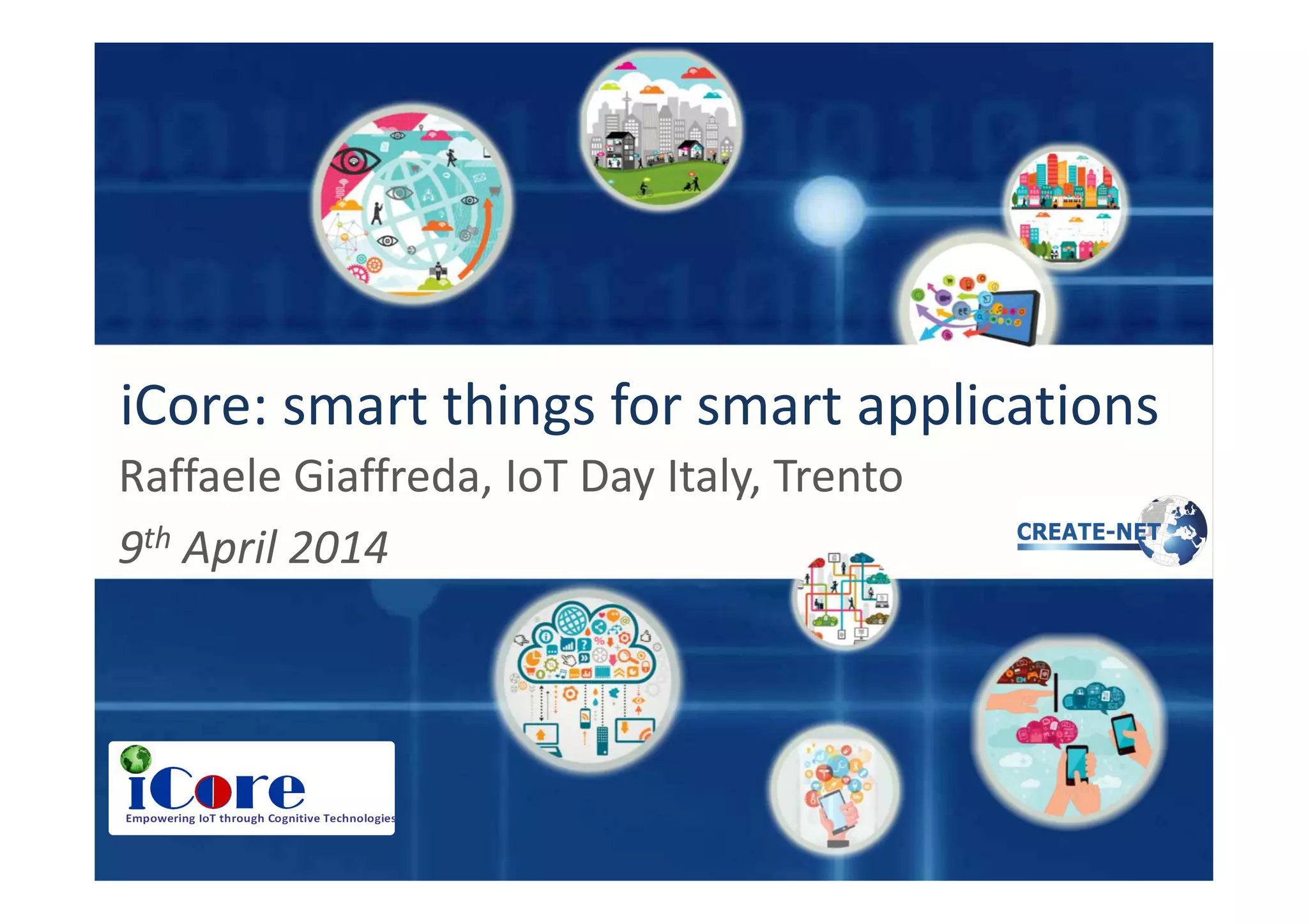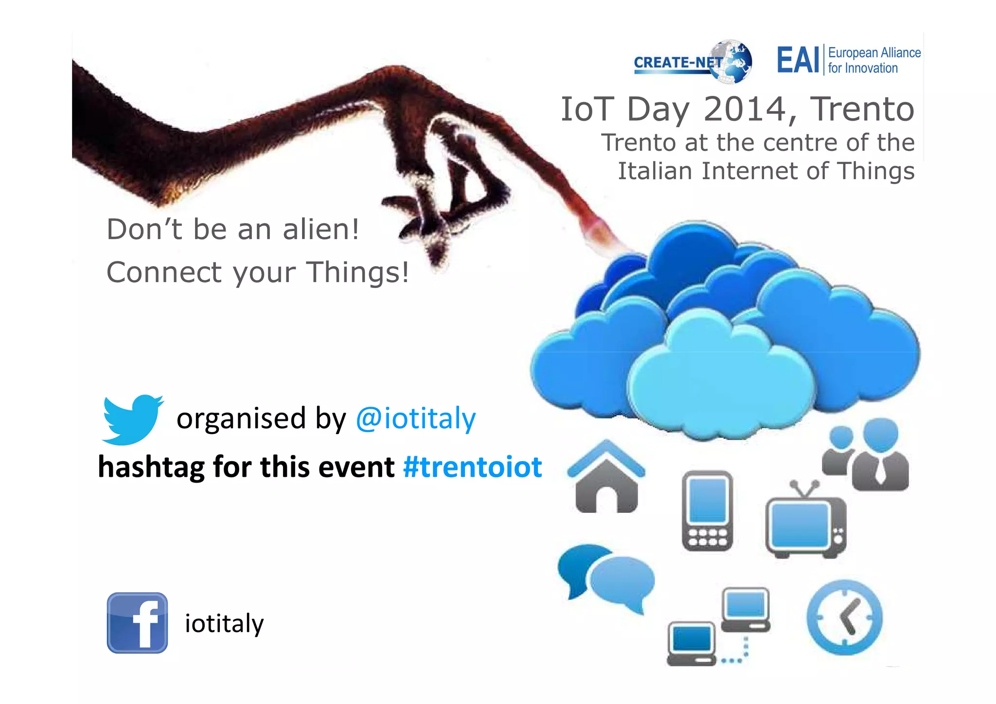 The document summarizes an IoT conference presentation about current and future trends in the Internet of Things. It notes that the number of connected devices is expected to grow exponentially to 50 billion by 2020, putting substantial demands on communication infrastructure. Current research aims to tackle bottlenecks through distributed edge computing and data processing to avoid overloading networks. Going forward, connected things will be able to socialize their status and integrate with human social networks, enabling spontaneous service provisioning through relevance and proximity-based discovery.