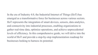The document provides a comprehensive guide on implementing the Industrial Internet of Things (IIoT) for businesses in the context of Industry 4.0, detailing the essential concepts such as connectivity, data collection, automation, and predictive maintenance. It outlines a step-by-step roadmap for implementation, highlighting key steps like defining objectives, conducting technology assessments, establishing connectivity, and ensuring cybersecurity. While IIoT offers significant efficiency gains and cost savings, the guide also addresses challenges such as data security, integration complexity, and the importance of ongoing optimization.
