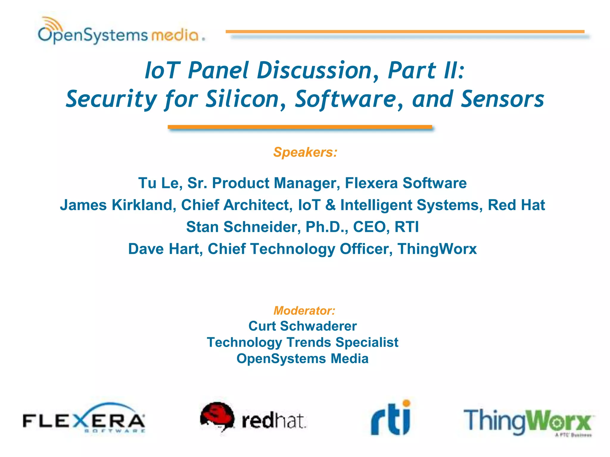 This document summarizes an IoT panel discussion on security for hardware, software, and sensors. The panelists discussed distinguishing characteristics and security concerns for industrial versus consumer IoT applications. They addressed important components of an IoT security architecture like authentication, corruption prevention, and spoofing protection. Panelists also discussed security considerations for sensors, software, hardware, and cloud services - including verifying sensor access, preventing hacking or software corruption, and protecting data in the cloud. The audience then asked questions of the panelists from Flexera Software, Red Hat, RTI, and ThingWorx.