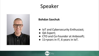 The document details an IoT testing manual presented by Bohdan Savchuk, aimed at various QA professionals, covering unique challenges and techniques in IoT testing. It outlines different approaches such as manual QA, cybersecurity, automation, and performance testing, along with their respective tasks, techniques, and benefits. The conclusion emphasizes the importance of integrating both manual and automated techniques for advancements in the IoT industry.