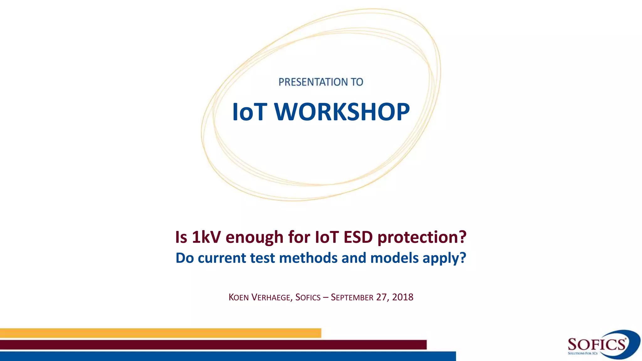 The document discusses the adequacy of 1kV for ESD protection in IoT semiconductor design, outlining the evolution of ESD standards and the challenges faced in modern applications. It analyzes risks based on various IoT applications through case studies, highlighting that while 1kV is generally sufficient under controlled conditions, specific scenarios may require higher levels of protection. The necessity for tailored ESD solutions and the importance of early design phase considerations are emphasized to address evolving threats in diverse operational environments.