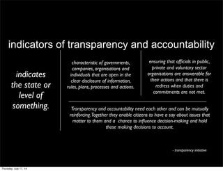 The document discusses a system for tracking transparency and accountability indicators across networks of organizations and users. It describes features like regionalization, time series analysis, and benchmarking of indicators. The system allows networks to define indicators and variables, while users can fill variables and create custom indicators and reports at the regional level. Data is shared using open formats and APIs to enable comparison of indicators across organizations and regions.