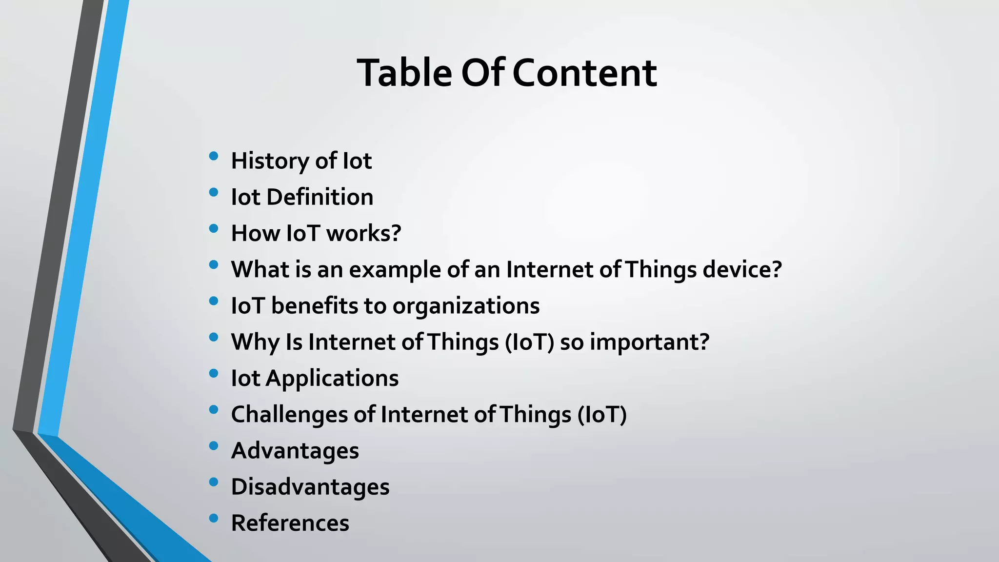 This document provides an overview of the Internet of Things (IoT), including its history, definition, how it works, examples of IoT devices, benefits to organizations, importance, applications, challenges, and advantages and disadvantages. It discusses how IoT works through sensors that collect data, connectivity to send data to the cloud, data processing, and user interfaces. Some key IoT applications mentioned include smart thermostats, connected cars, activity trackers, and smart cities. The document also outlines challenges around testing, security, software complexity, and data volumes, as well as advantages such as access to information from anywhere and automating tasks.