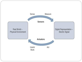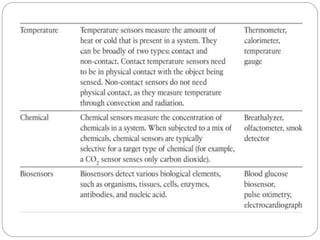 This document provides an overview of sensors, actuators, and smart objects which are fundamental building blocks of IoT networks. It defines sensors as devices that measure physical quantities and convert them to digital representations. Actuators receive control signals and trigger physical effects. Smart objects contain embedded technology to sense and interact with their environment. They have processing units, sensors/actuators, communication devices, and power sources. The document discusses various sensor and actuator categories and trends. It also covers wireless sensor networks, communication protocols, and connecting smart objects in IoT.