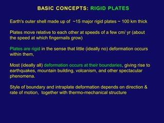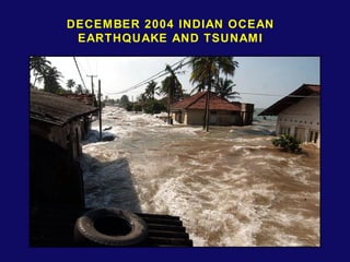 This document summarizes concepts related to the 2004 Indian Ocean earthquake and tsunami. It describes how earth's plates move and interact at boundaries, generating earthquakes and tsunamis. It discusses how the India plate is moving north and colliding with Eurasia, causing earthquakes along the Sumatra subduction zone. The 2004 quake had a magnitude of 9.3, rupturing 1200 km of the fault and generating a massive tsunami that caused widespread damage across the Indian Ocean.