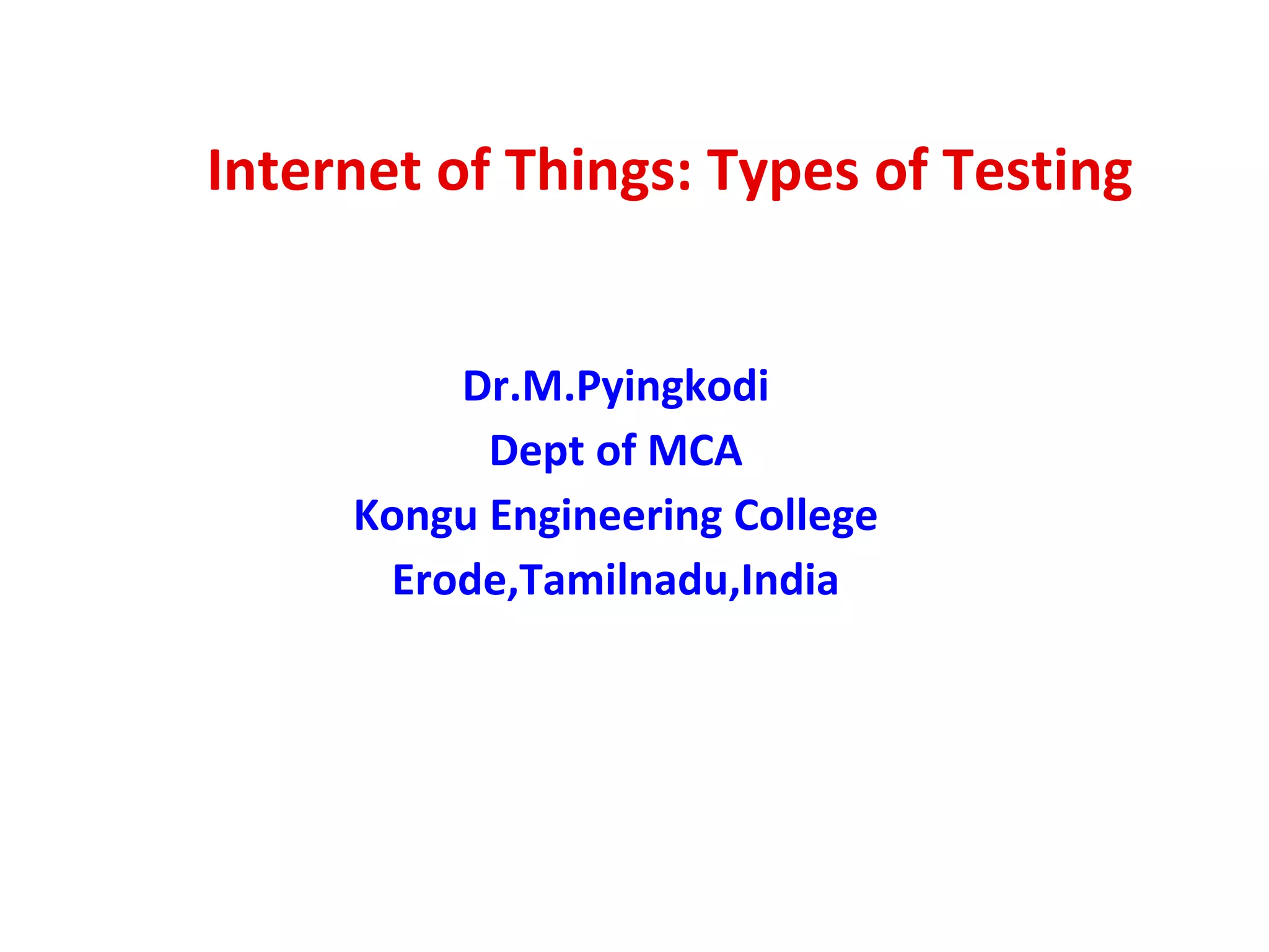 The document discusses various types of testing for Internet of Things (IoT) infrastructure. It covers component testing of devices, communications, and computing. It also discusses user experience testing, including usability, target audiences, and user behavior analysis. Finally, it discusses different types of infrastructure testing like integration testing, load testing, compatibility testing, and performance testing to evaluate how the IoT system performs under various conditions.