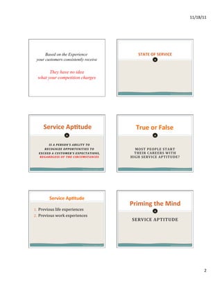 This document discusses creating a customer service revolution by transforming employee and customer experiences. It advocates shifting to a customer-centric culture that improves sales, morale, and brand loyalty, making price irrelevant. The key is consistently providing excellent customer experiences, as customers will have no idea what competitors charge based on the experience your company provides.