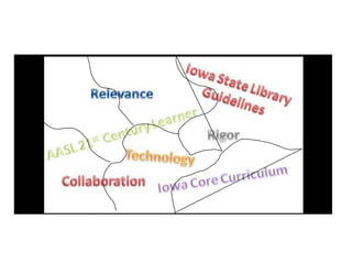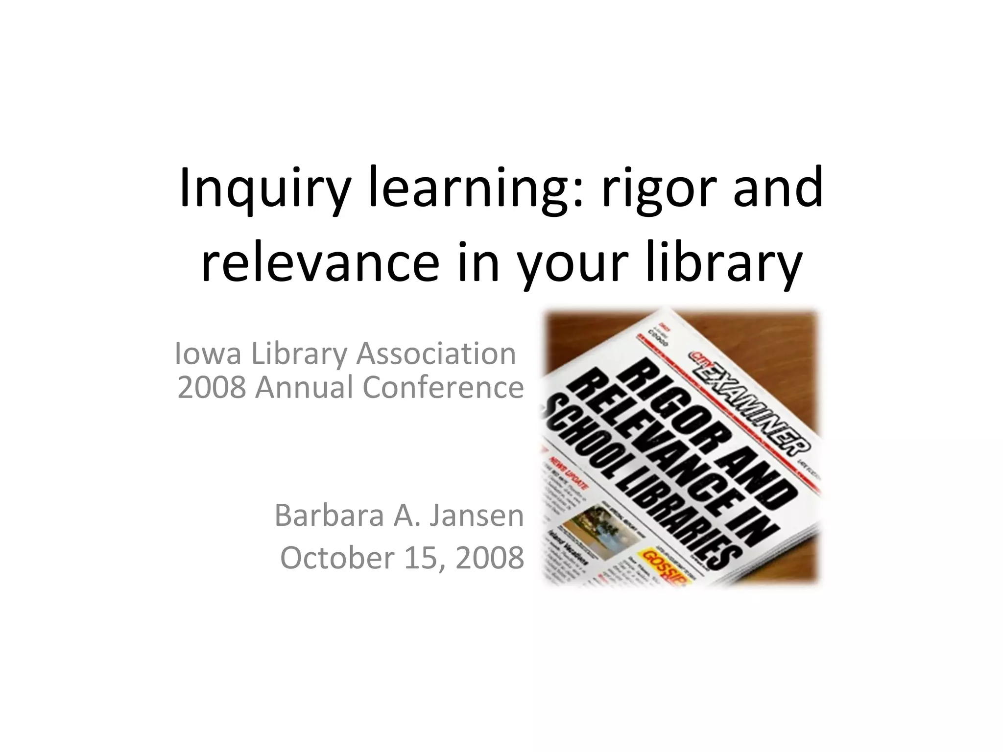 The document summarizes a presentation on inquiry learning and how to promote rigor and relevance in libraries. It discusses inquiry learning from the student perspective, how libraries can promote rigor and relevance through the Iowa Core Curriculum and state library guidelines. It also lists different levels of collaboration, tools for information search processes, and websites related to literacy, summer reading lists, and 21st century learning standards.