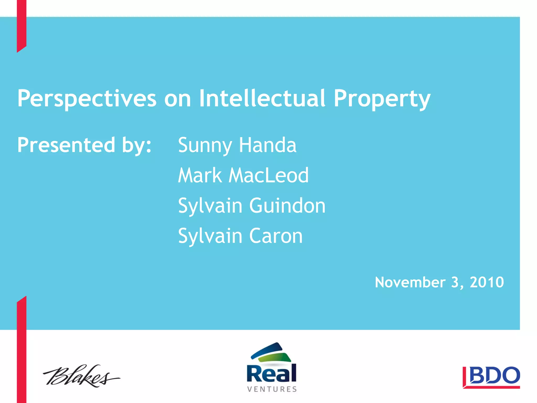 The document presents a detailed overview of intellectual property (IP) perspectives, including legal, operational, tax, and valuation aspects, discussed by several experts during a panel. It covers various types of IP such as copyrights, patents, trademarks, and trade secrets, their legal frameworks in Canada, and specific considerations for commercializing and transferring IP. Additionally, the document highlights the financial implications, including costs associated with IP and tax treatments relevant to business operations and investments.