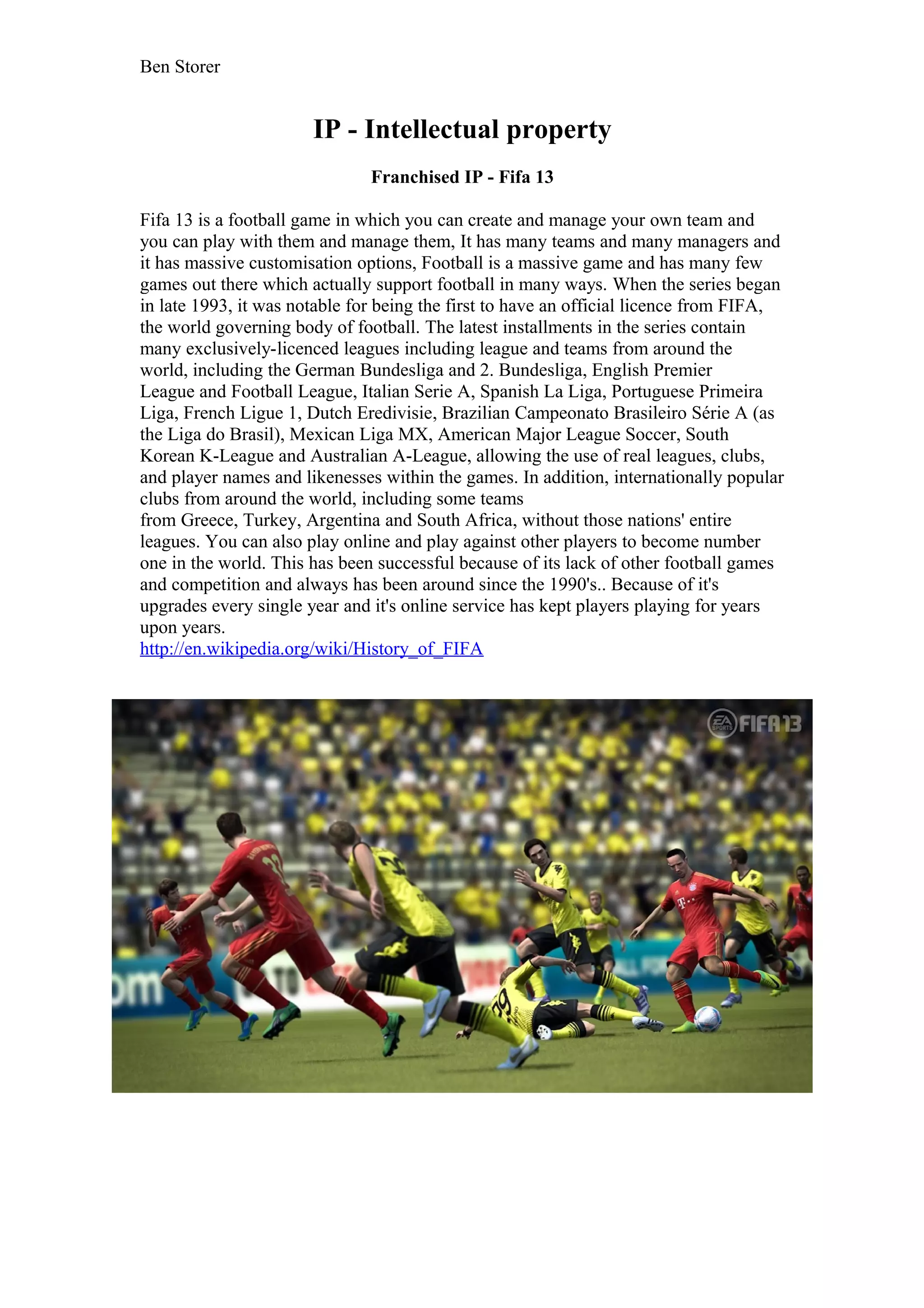 Fifa 13 is a football simulation game that allows users to create and manage their own virtual team. It features officially licensed leagues, teams, players and managers from around the world. Users can also play against other online players. The Fifa franchise has been successful since the 1990s due to a lack of competition and its annual upgrades and online services that keep players engaged for many years.