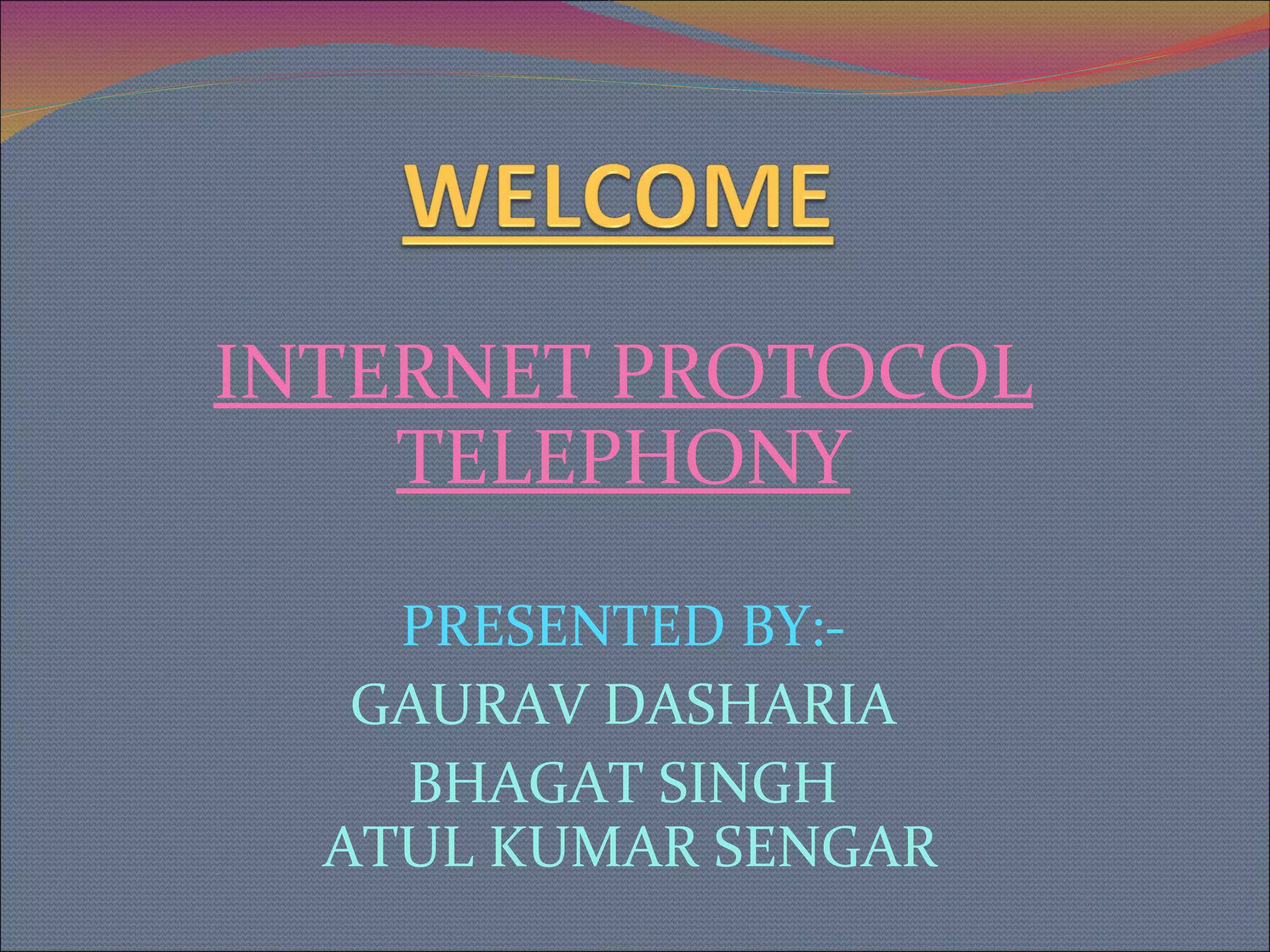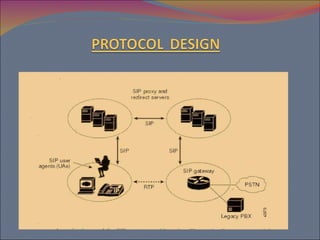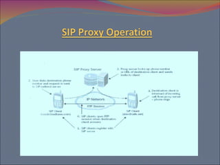 This document provides an overview of Internet Protocol Telephony (VoIP). It discusses how VoIP works by digitizing and compressing voice into packets transmitted over the Internet. It also covers some of the common protocols used, including Session Initiation Protocol (SIP) and H.323, and compares their advantages. Potential applications and challenges of VoIP are also mentioned.
