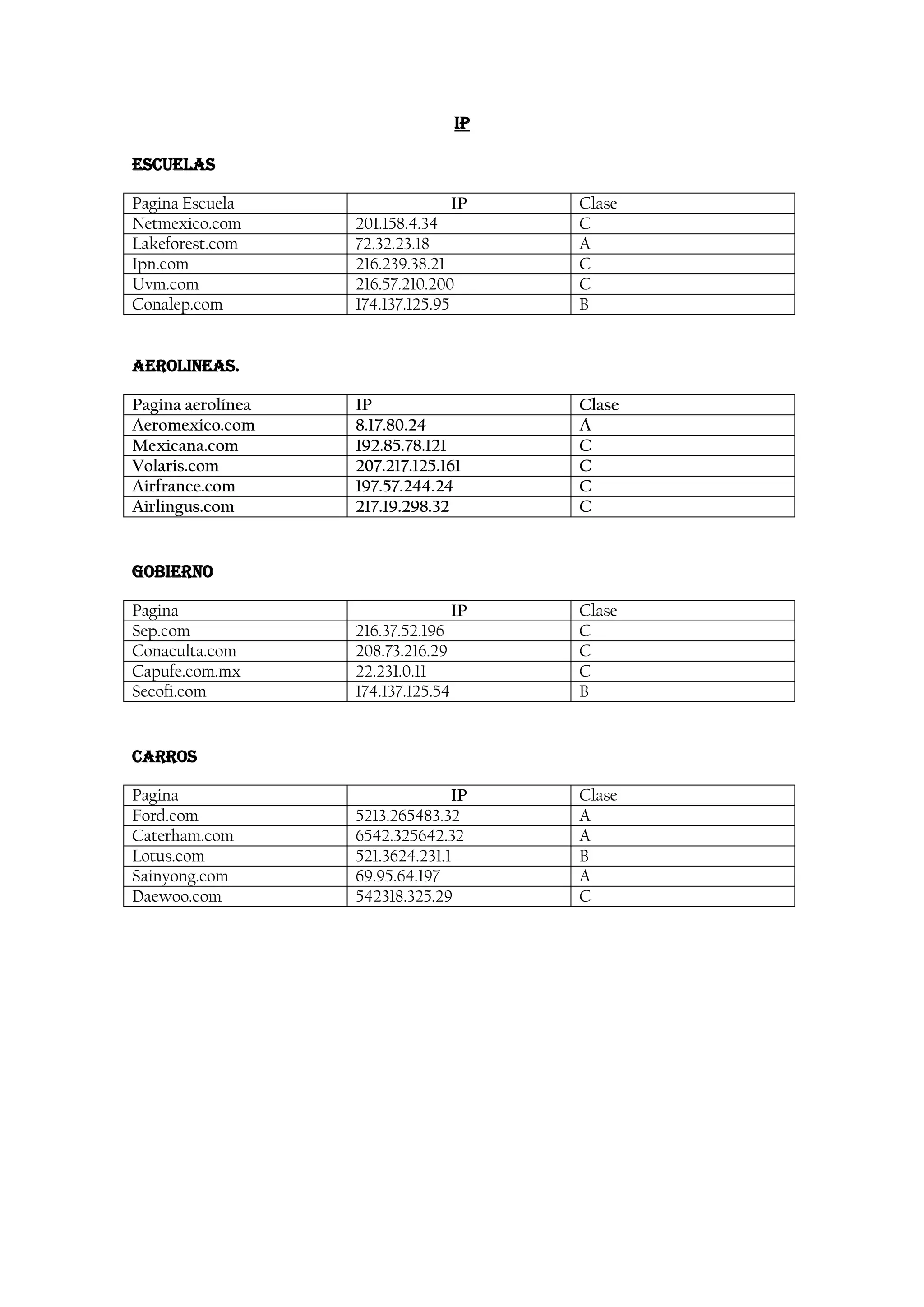 The document lists various websites from different categories (schools, airlines, government, cars) along with their IP addresses. For each category, 2-3 websites are listed with their corresponding IP addresses, showing the domain name and class of IP addresses for entities within Mexico and other countries.