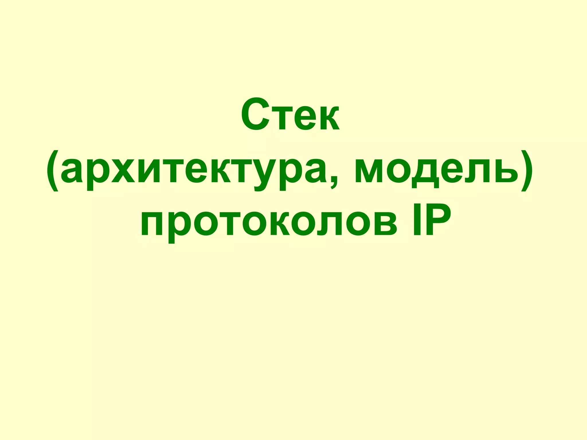 Документ описывает архитектуру и протоколы стека IP, включая IP, TCP и UDP, акцентируя внимание на их функциях, форматах заголовков и процессе инкапсуляции данных. Протокол IP обеспечивает передачу данных без установления соединения, не гарантируя надежность и порядок доставки пакетов. Также рассматриваются механизмы маршрутизации и приоритезации трафика, а также различия между TCP и UDP по качеству доставки.