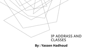 The document explains IP addresses, defining them as unique identifiers for devices on the internet structured in 32 bits divided into four octets. It categorizes IP addresses into classes A, B, C, D, and E, each with specific ranges and purposes, such as class A for large networks and class D for multicasting. It also provides examples of IP addresses and their corresponding classes based on the first octet values.