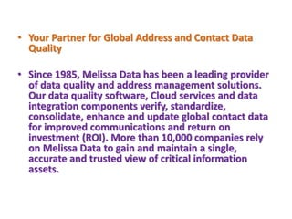 Melissa Data is a leading provider of data quality and address management solutions since 1985, helping over 10,000 companies enhance their global contact data. Their software tools, including the IP address locator, support businesses in profiling web traffic, improving business intelligence, and targeting ad campaigns. Key features include geographical data retrieval and free technical support.