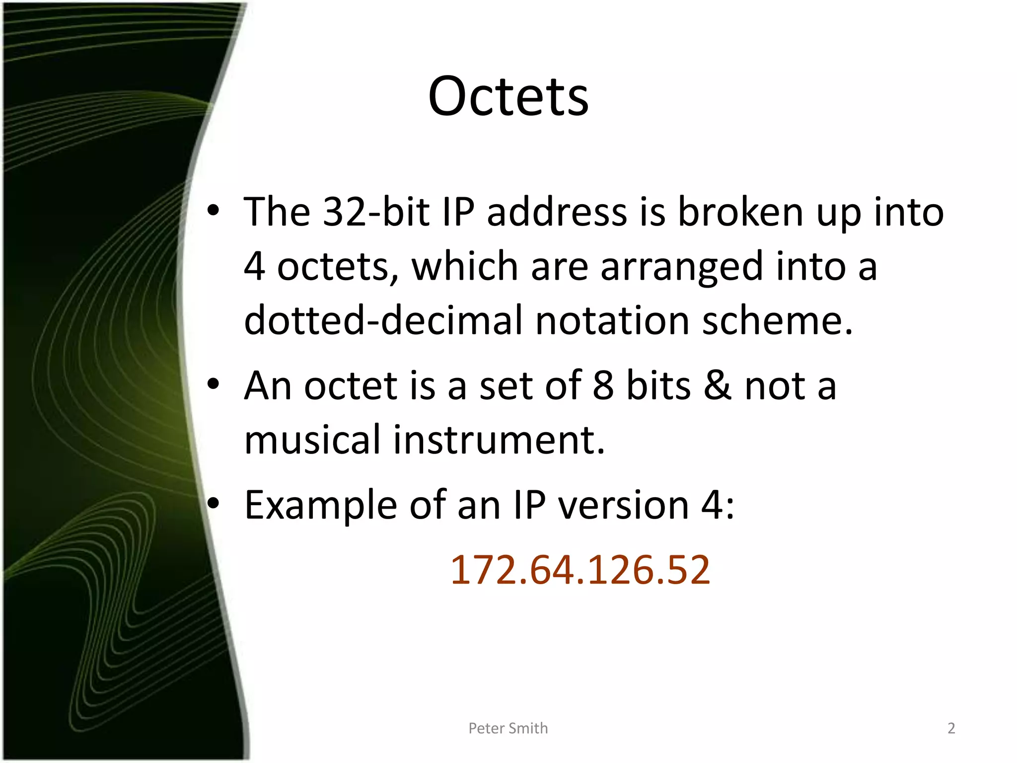 The document discusses IP addressing and the classification of IP addresses. It explains that IP addresses are made up of 4 octets and broken into classes A through E. It provides details on each class, including how many bits are used for the network and host portions and the number of available networks and hosts. Special addresses like private IP addresses that start with 10, 172.16, or 192.168 are also discussed.