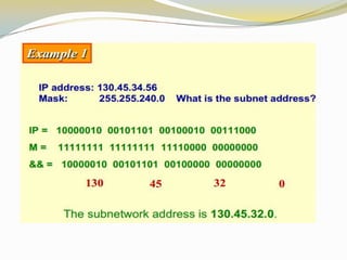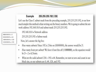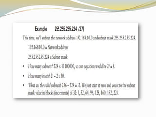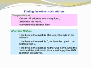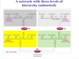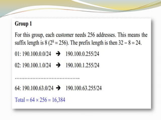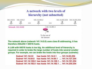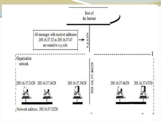 The document discusses the Internet Protocol (IP) which is the cornerstone of the TCP/IP architecture and allows all computers on the Internet to communicate. There are two main versions of IP - IPv4, the currently used version, and IPv6 which is intended to replace IPv4 and includes improvements like longer addresses. IP addresses are 32-bit for IPv4 and 128-bit for IPv6. Strategies like private addressing and Classless Inter-Domain Routing (CIDR) help conserve the limited number of available IP addresses.