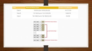 IPv4 addresses are 32-bits long, allowing for over 4 billion unique addresses. 192.168.0.1 is often used as a default local router address for devices like D-Link routers. A subnet mask is used with an IP address to split it into an extended network address and a host address portion rather than functioning as an address on its own.