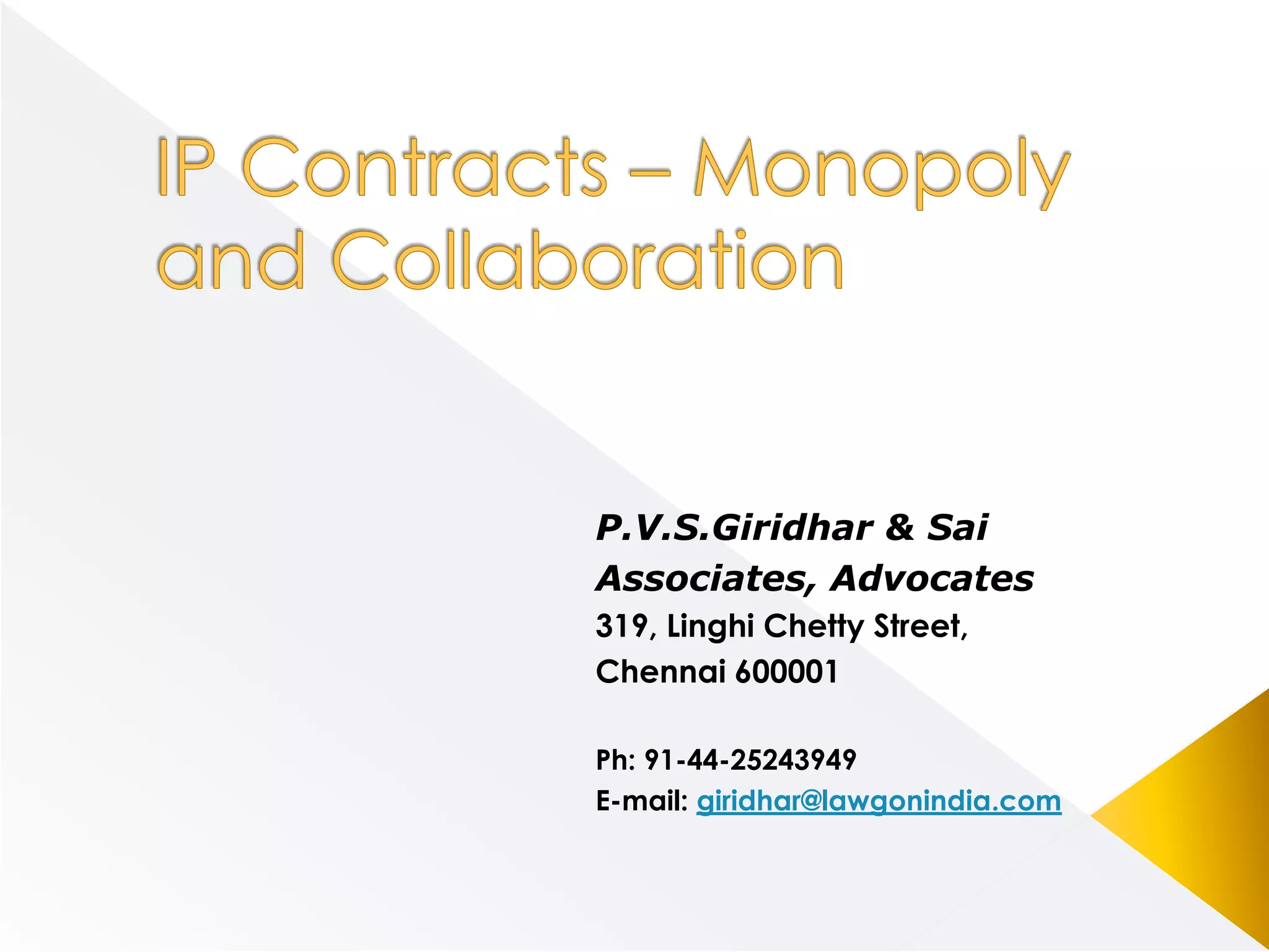 This document discusses intellectual property law and strategies for technology businesses. It provides an overview of different types of intellectual property including patents, copyrights, trademarks, trade secrets, and designs. It then discusses considerations for businesses around IP generation, protection, infringement, sharing, and licensing. Specific agreements related to development, technology sharing, licensing, and non-disclosure are also mentioned. The document emphasizes strategies for collaboration over monopoly and addresses balancing investment, risk management, and profit/revenue goals. It is presented by P.V.S.Giridhar & Sai Associates, Advocates.