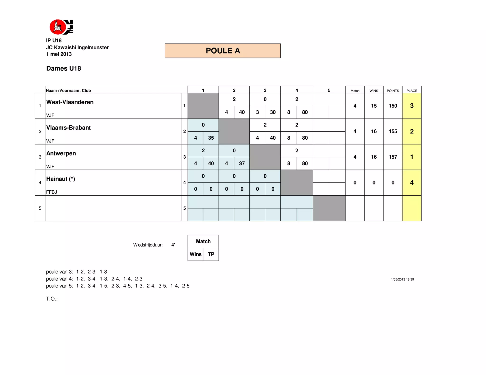 Finale Wedstrijdduur : 4' 2de plaats A1 3 Antwerpen VJF 4 31 1ste plaats B2 8 Liège FFBJ 3 30 3 Antwerpen 4 37 2 Vlaams-Brabant A2 2 Vlaams-Brabant VJF 5 29 2 Vlaams-Brabant 4 40 B1 6 Oost-Vlaanderen VJF 3 30 8 Liège 4 35 3de plaats 8 Liège 6 Oost-Vlaanderen 3 30 IP U18 JC Kawaishi Ingelmunster 01/05/13 01/05/13 18:39