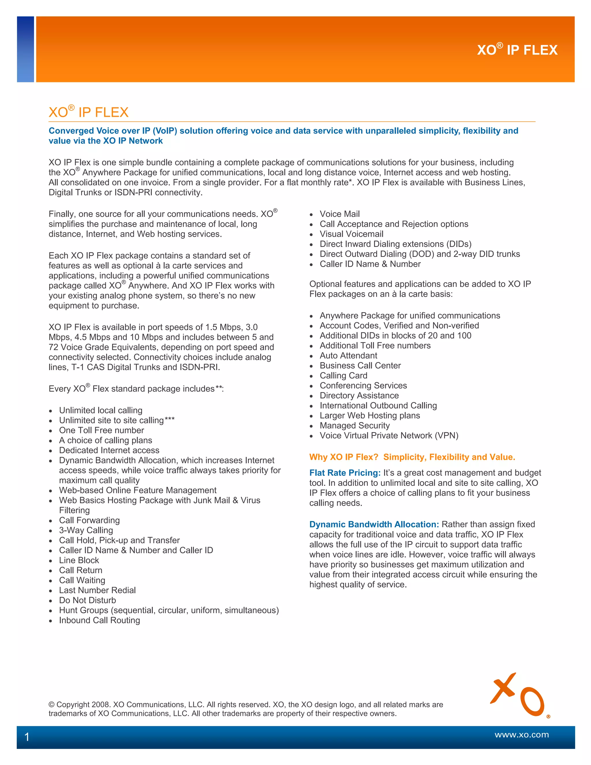XO IP Flex is a converged voice over IP solution that offers voice and data services through a single package for a flat monthly rate. It includes local and long distance calling, internet access, web hosting, and unified communications features. Customers can choose from port speeds and connectivity options. Standard features include unlimited local/site calling, a toll free number, web hosting, and call management tools. Optional applications like auto attendant, VPN, and call centers are also available.