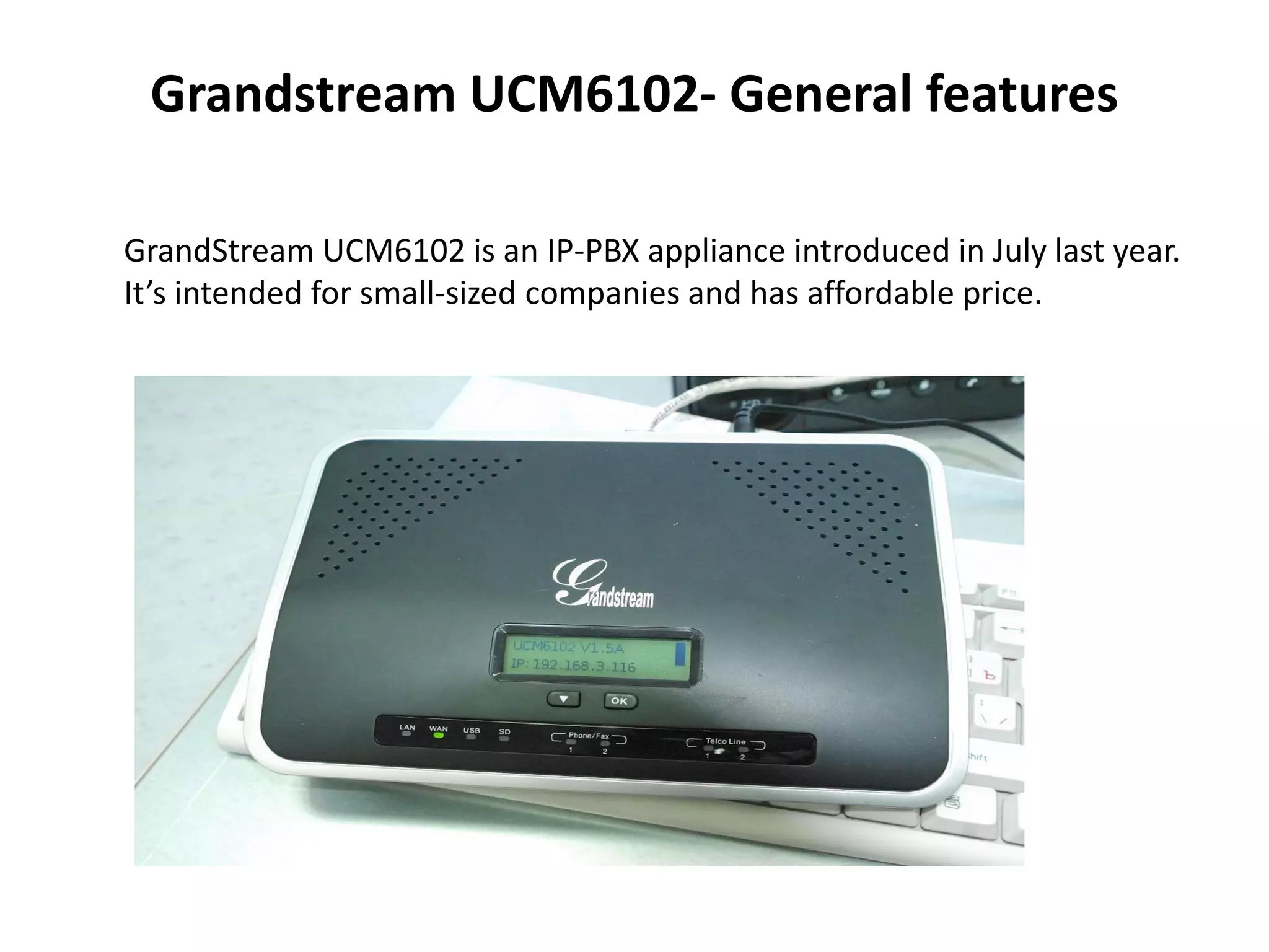The Grandstream UCM6102 is an IP-PBX appliance designed for small to mid-sized companies, featuring Asterisk software and a user-friendly web interface. It supports 30 concurrent calls with various ports and advanced functionalities, while also implementing fault tolerance with direct connections during power outages. Limitations include a closed configuration that restricts direct manipulations and potential queue monitoring capabilities, making it less suitable for call centers.
