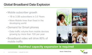 The document discusses the increasing demand for wireless backhaul solutions driven by the explosive growth of mobile data traffic and the transition to 4G/LTE networks. It highlights the need for operators to enhance their network capacity and infrastructure to meet the requirements of modern mobile communication while managing the operational challenges associated with this transition. Aviat Networks is positioned as a leader in providing technologies for efficient IP network migration and backhaul solutions.