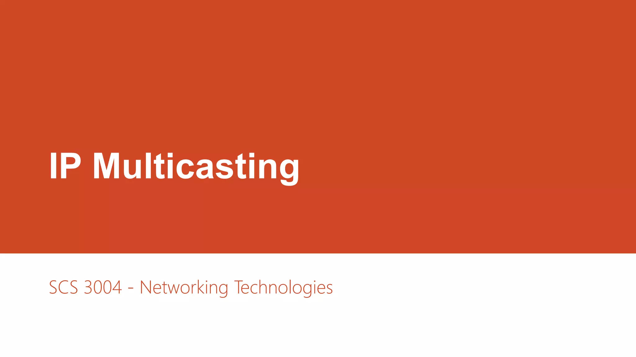 The document provides a comprehensive overview of IP multicasting, detailing its benefits such as improved bandwidth utilization and reduced processing for hosts and routers. It explains the differences between unicast, broadcast, and multicast transmission methods, as well as multicast addressing and the Internet Group Management Protocol (IGMP) for managing group membership. Additionally, it covers IGMP message types and packet formats, outlining how hosts communicate with routers to maintain multicast group membership.