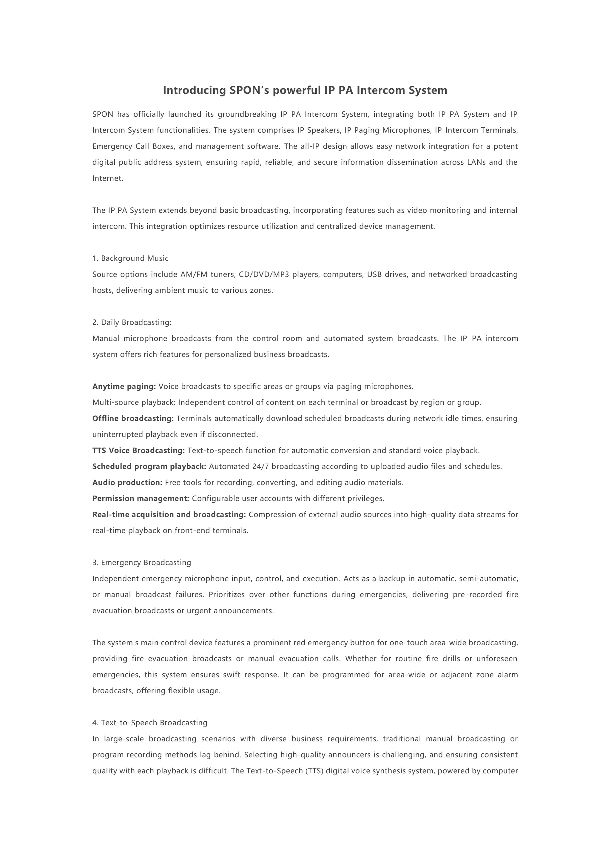 Spon has launched an advanced IP PA intercom system that combines IP public address and intercom functionalities, featuring IP speakers, microphones, intercom terminals, and emergency call boxes for efficient information dissemination. The system supports a range of broadcasting options, including text-to-speech, multi-source playback, and audio-text synchronization for enhanced accessibility, especially for hearing-impaired users. Additionally, it integrates surveillance capabilities and offers a visual management platform to streamline operations and emergency communication across various environments.