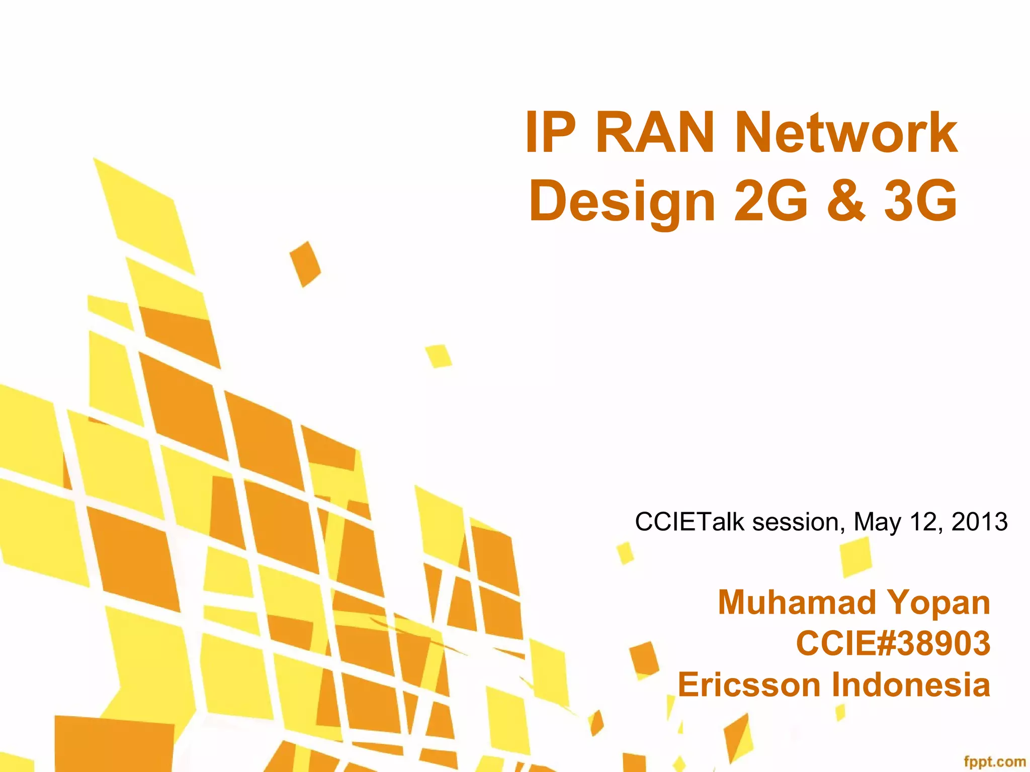 This document provides an overview of IP RAN network design for 2G and 3G networks. It discusses key aspects of IP RAN including transport connectivity, network synchronization, quality of service, and security. The document also presents case studies of 2G and 3G network topologies designed using IP RAN principles.