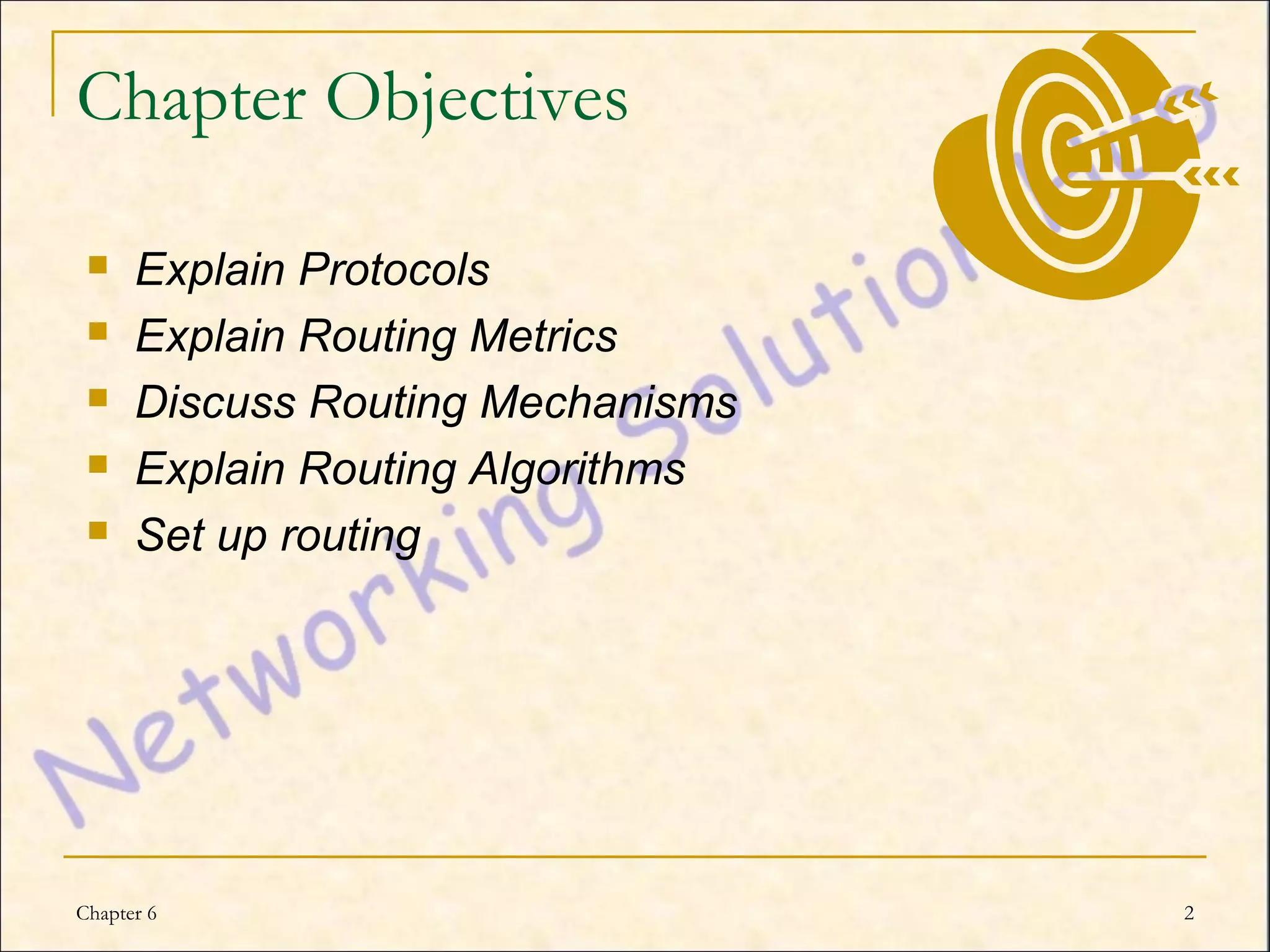 The chapter discusses IP routing and routing protocols. It explains the goals of routing which include stability, robustness, dynamic path updates, and secure information transmission. It also covers routing metrics, interior and exterior routing protocols, static and dynamic routing, routing tables, and the Routing Information Protocol (RIP). RIP uses hop count as its metric and supports up to 15 hops between routers. Enhancements in RIPv2 include multicast updates, triggered updates, classless operation, and authentication.