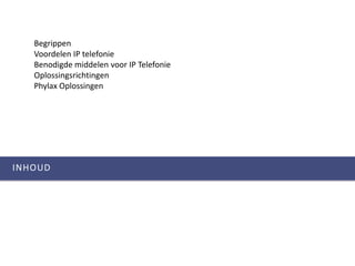 BegrippenVOIP = Voiceover Internet Protocol IP telefonie = het transporteren van telefoongesprekken met het IP protocolIP telefooncentraleszijneencombinatie van hardware en software die de interne telefoongesprekkenbinneneenorganisatieover het datanetwerktransporterennaar de gebruikersUnified Communications is eenverzamelnaamvooralletechnologiewaarmeespraak, video, fax, chat en mail in 1 systeemwordtgebundeldVoor het transporteren van telefoongesprekkennaar de buitenwereldkangebruikwordengemaakt van: AnalogelijnenISDN bundelsPubliekeinternetverbindingenPrivé data verbindingennaareenspraakprovider