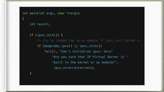 The document provides an overview of IPVS (IP Virtual Server), a transport-layer load balancing solution implemented in the Linux kernel, detailing its architecture, integration with Kubernetes, and load balancing methods. It includes a demonstration of setup and configuration, comparisons with iptables and LVS, and an explanation of associated tools and user commands needed for managing services. It also addresses debugging challenges and features resources for further learning about Kubernetes and cloud-native technologies.