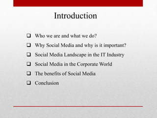 The document discusses the importance of social media for companies. It notes that social media is the fastest growing communications channel and allows companies to analyze customer journeys, monitor competitors, and engage in sophisticated social listening. It also outlines some of the benefits companies see from social media, including increased brand recognition, higher brand authority, and improved sales. Finally, the document concludes that social media provides companies opportunities to boost their brand identity, visibility, competitive advantage, and user experience in a more flexible and cost-effective manner.